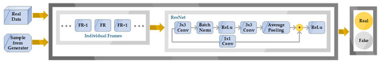 The spatial discriminator receives the real data and the samples from the generator as input. The task of the spatial discriminator is to look at the individual frames and correctly identify whether the sample is from real data distribution or from the generator. The spatial discriminator uses a ResNet architecture. We use convolutions, a batch normalization layer and a rectifier linear unit (ReLu) as the activation function. To change the number of strides we introduced a convolutional layer. We used strided convolutions for down-sampling and the last layer did a binary classification to identify real or fake. The resolution of the frames depicts the number of residual blocks. The resulting latent vector with skip connection was defined as 160 for resolution , 180 for and 200 for . Figure 4 is an overview of the spatial discriminator.