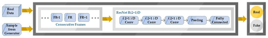 Differently from [11], we use R(2 + 1)D convolutional ResNet instead of a 3D ResNet. We build (2 + 1)D block of and 2D convolutional filters of , where are temporal convolutions of size . Here t denotes temporal features and d is the width and height of the spatial component. The advantages of using a (2 + 1)D ResNet is that the extra ReLU in each block of the 2D and 1D convolutions increases the number of non-linearities and the complexity of the functions representing several small filters. Another advantage is that the optimization becomes easier when the 3D is broken down to (2 + 1)D in the ResNet architecture. We process the videos from the real or generated distribution using average pooling. The discriminator is trained to differentiate between synthetic and real frames and to identify temporal features from each frame. The last layer is a binary classification layer the same as the spatial discriminator that outputs real or fake. Architecture for the temporal discriminator is shown in Figure 5.