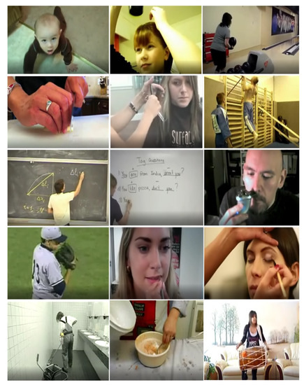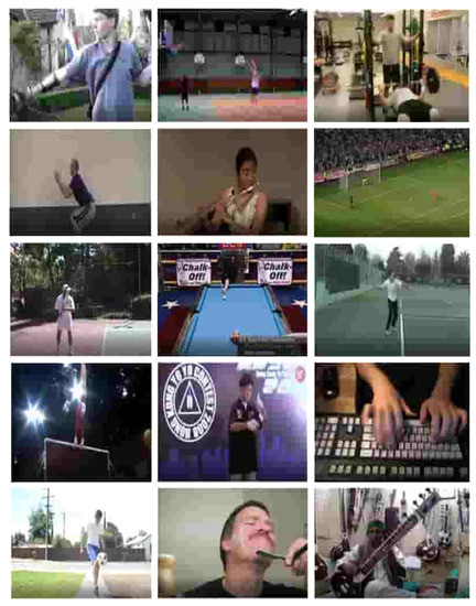 - Kuehne, H.; Jhuang, H.; Garrote, E.; Poggio, T.; Serre, T. HMDB: A large video database for human motion recognition. In Proceedings of the 2011 International Conference on Computer Vision, Barcelona, Spain, 6–13 November 2011; pp. 2556–2563. [Google Scholar]