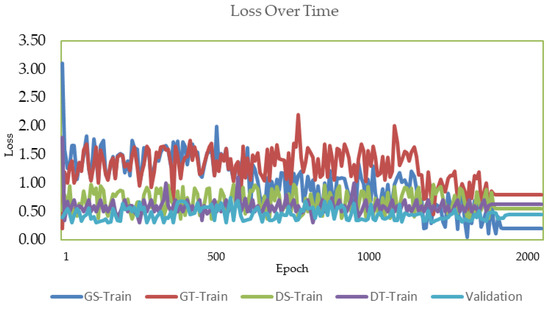 Median recover error (MRE) and MRE-gap described in the paper [39] have been used to detect whether our model overfits. In [39], the author states that the p-value of the Kolmogorov–Smirnov test (KS) can be evaluated to estimate the degree of overfitting. A model with a p-value that is below 1% and MRE-gap above 8% has been considered to be overfitting. Our model has generated results for p-value above 1% and MRE-gap below 8% which concludes that our model prevents overfitting. Figure 11 shows the loss over time for training and validation.