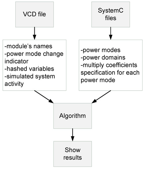 Data processing from the VCD and SystemC files works in the following way: in the VCD file, the algorithm finds all modules, ports, and variables for each module. These variables are hashed into HashMap, in which the hash-key is represented by the variable and corresponding module names separated by a space (e.g., “dut cpu”). For each key, the previous state of the variable is saved to HashMap. In the SystemC file, the algorithm identifies a top module, which contains the power-management specification. The top module is identified based on the created hierarchy of SystemC modules. After identifying the top module, the algorithm starts to identify the power domains, power states, power modes, and the module constructor. The constructor contains the power management specification, especially in which power state a power domain operates in a specific power mode. This information is then saved. It is also necessary to calculate a coefficient for each DIFF_LEVEL power state, which is calculated as the arithmetic average between the NORMAL and DIFF_LEVEL power states.