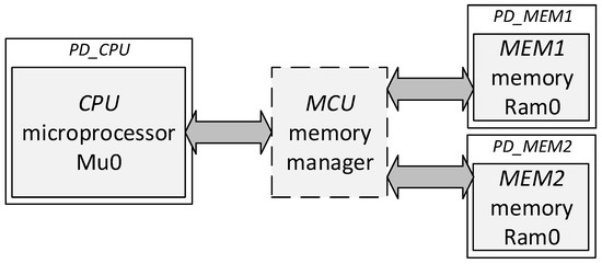 As a case study, we have used a simple system, consisting of one microprocessor (CPU) communicating with two memories (MEM1 and MEM2) via a memory manager (MCU). The CPU and MEM components are based on the mu0 and ram0 VHDL descriptions from [39]. MCU selects the MEM component, with which the CPU communicates. The abstract architecture of the case-study system is illustrated in Figure 3.