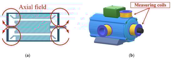 External stray (axial) flux in a squirrel cage induction motor (a) and method of possible placement used for the axial flux measuring coils (b).