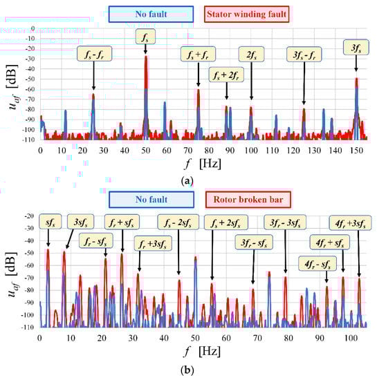 The effect of IM electrical circuit defects on the spectrum of the voltage induced in a measuring coil by an axial flux. Axial flux spectrum: (a) for an undamaged motor (Nsh = 0) and with 5 shorted turns in phase A (Nsh = 5), fs = 50Hz, TL=0.2 TLN; (b) for an undamaged motor (Nbb = 0) and with 3 broken rotor cage bars (Nbb = 3), fs = 50Hz, TL=0.8 TLN.
