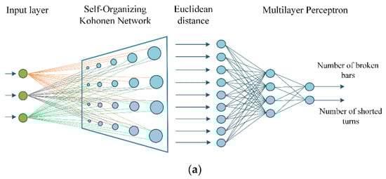 In addition to the basic MLP and SOM structures discussed here, there is a great deal of interest in the literature on neural networks with radial basis functions (RBF) [,,,]. The main difference between MLP and RBF is the activation function used in the hidden layer. This difference influences the task of the NN network. In the case of MLP, this is the approximation of the analyzed function, while RBF performs a local approximation, taking into account the cluster of data around the central point. In [], the authors demonstrated the superiority of the RBF network over MLP in the process of detecting damage to IM electrical circuits. The comparison of the two structures was possible due to the use of the same number of neurons in individual layers, as well as the same learning and testing vector.