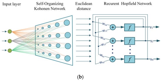 Recursive neural networks (RNNs) are also used in diagnostic processes. A characteristic feature of these networks is the presence of feedback loops in their structure. The primary representatives of recursive networks used in the IM diagnostics are the Elman network (ENN) [,] and the recursive Hopfield network (RHN) [,,]. The recursive Hopfield network is characterized by associative memory, thanks to which it is mainly used for pattern recognition []. The Elman network has a simplified recursion model and is used in the processing of time series []. In the IM diagnostic systems, the Elman network is more often used [,] due to the applied data processing method. Nevertheless, the associative memory of the Hopfield network is widely used in error recognition systems, e.g., electronic [] or electromechanical [] systems.