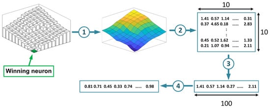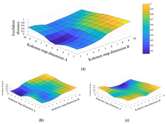 - Recording of the Euclidean distance measure in the form of a matrix with dimensions equal to the size of the selected Kohonen map (in this case (10 × 10));