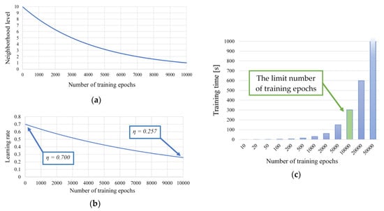 Training parameters of the SOM network: (a) neighborhood level; (b) learning rate; (c) learning time.