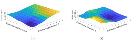 Damage classifiers also play a very important role in diagnostic processes. The main representative of neural damage classifiers is the Kohonen self-organizing network (SOM). Possible applications of the SOM in the detection and classification of IM faults are presented in [,,,,,,], among others. The undoubted advantage of the Kohonen network is the relatively small size of the training vector required to ensure a high efficiency level. SOM is characterized by its simple mathematical description, as well as the short time of the training process, which resulted in the creation of numerous variations of this structure. As in the case of the MLP, the efficiency of the SOM network in IM fault classification is strongly dependent on the structure used. The impacts of the SOM network topology, neighborhood function, as well as the scope of neighborhood, are discussed in [,]. In [], the influence of the number of neurons in the network output layer on the classification effectiveness of electrical rotor faults in IM using SOM was presented.
