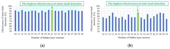 Particularly noteworthy are the results shown in Figure 10b, due to the fact that when the motor is idling, the components of the axial flux spectrum characteristic of the incipient rotor fault coincide with those for the motor without damage in the rotor (Equation (3)). However, in the case of the developed CdNN, an efficiency result for rotor failure detection of the load torque TL≈0 of close to 90% was obtained, which is a very good result compared to the effectiveness of a single SOM network or MLP network, as shown in Section 2.2.1 and Section 2.2.2 and in [].