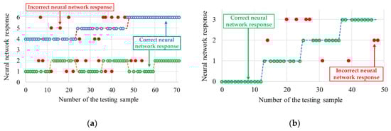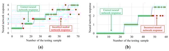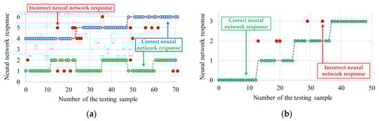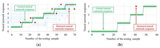The results of the experimental verification of the developed SOM–RHN structure are shown in Figure 11 and Figure 12. By analyzing the received CdNN responses to the given test vectors, it was noted that the SOM–RHN structure was characterized by lower detection (97.2%) and classification (80.3%) of the stator winding damage (Figure 11a) compared to the structure of SOM–MLP. In addition, incorrect network responses appear more randomly, making it more difficult to determine their sources. Nevertheless, the extension of RHN to the precedent SOM network enables a significant improvement in fault detection and classification ability in comparison to a single RHN structure (Table 3).