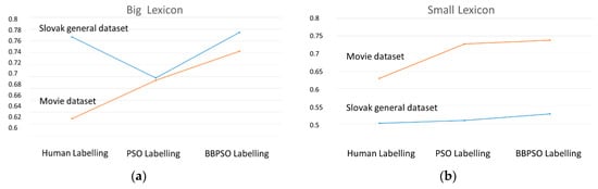 For both lexicons, three versions were generated: The first version was labelled manually by a human annotator, the second version was labelled by PSO, and the third one using BBSPO. Then, all versions were used for opinion analysis of post texts in the Slovak language and tested. We could engage more annotators in the process of human labelling, but the subjectivity of labels would remain, and averaging the values of labels may obscure the accurate estimation of the word polarities by one expert human.