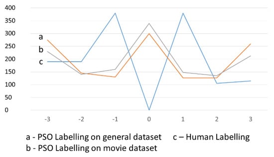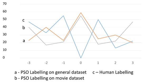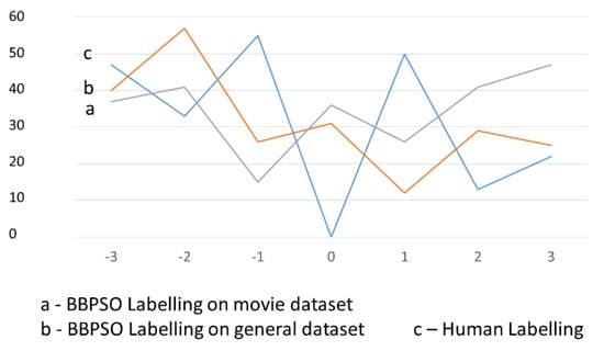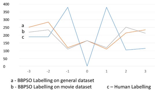 The main purpose of this section is the comparison of human labelling and automatic labelling, in order to answer the following questions: Which integer labels are preferred in PSO and BBPSO labelling, in comparison with human labelling? Can the subjectivity of human labelling cause a decrease of effectiveness of lexicon-based opinion classification?