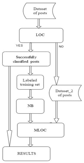 At first, Lexicon-based Opinion Classification (the “LOC” block) is applied to classify all posts in the data set. Once all posts are classified either successfully (YES) or unsuccessfully (NO), the dataset is split into two groups: labelled and unlabelled posts (Dataset_2). Labelled posts represent the training set, which is used for Naïve Bayes model training (the “NB” block). The trained Naïve Bayes model is then applied to classify posts in Dataset_2 which were not classified by Lexicon-based Opinion Classification; this is the “MLOC” (Machine Learning Opinion Classification) block. All classified posts, as classified by LOC and MLOC, are then saved (the “RESULTS” block).