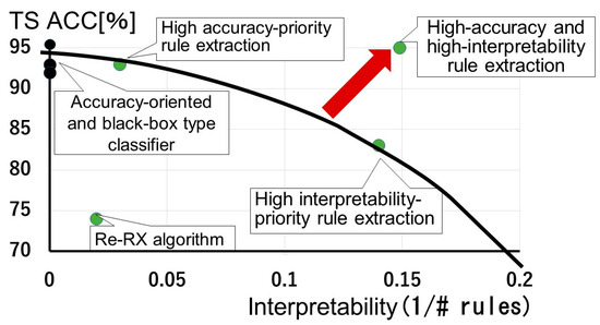 As shown in Figure 1, the best trade-off is when accuracy and interpretability can be enhanced simultaneously. The black line indicates the trade-off curve (Pareto optimal), which balances accuracy and interpretability. The red arrow indicates a shift from the trade-off curve to the ideal point (high-accuracy and high-interpretability; most concise). We previously proposed a method to achieve high accuracy-priority rule extraction [18]. “Black box” classifiers can be plotted as black dots placed vertically on the axis for the test dataset accuracy (TS ACC). These accuracies are often higher than those obtained using high accuracy-priority rule extraction for credit scoring datasets, which indicates that the latest high-performance classifier for the Australian dataset does not completely overcome the accuracy–interpretability dilemma [10]. In this section, as Re-RX with J48graft is the most important component of our proposed method, we depict it using mathematical notations in Figure 2.