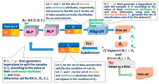 The Re-RX algorithm developed by Setiono et al. [22] repeats a backpropagation NN (BPNN), NN pruning [27], and a C4.5 decision tree (DT) [28] in a recursive manner. A major advantage of the Re-RX algorithm, which was designed as a rule extraction tool, is that it provides a hierarchical, recursive consideration of discrete variables prior to the analysis of continuous data. Additionally, it can generate classification rules from NNs that have been trained based on discrete and continuous attributes. We previously proposed Re-RX with J48graft [29] for improving the interpretability of extracted rules, Continuous Re-RX [30] for improving the accuracy of rule extraction, and Continuous Re-RX with J48graft [18] for high accuracy-priority rule extraction.