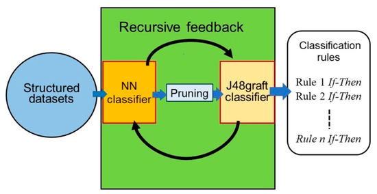 To achieve both highly concise and accurate extracted rules, we recently proposed Re-RX with J48graft [29,31], which is a “white box” model capable of providing highly accurate and concise classification rules. As the potential capabilities of Re-RX with J48graft are somewhat unclear in regard to extracting highly accurate and concise classification rules, we decided to elucidate the synergistic effects between grafting and subdivision, which work effectively in combination. For a better understanding of the mechanism underlying Re-RX with J48graft, a schematic overview is provided in Figure 2.