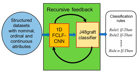 Next, Re-RX with J48graft was applied to extract highly concise rules for datasets consisting of heterogeneous attributes (nominal, categorical, and numerical attributes). The 1D FCLF-CNN with Re-RX with J48graft (Figure 6) achieved highly concise rule extraction.