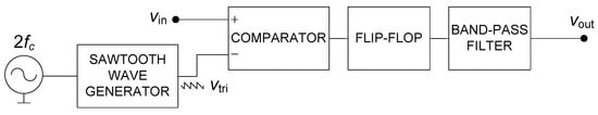 A switching-circuit phase modulator is shown in Figure 2 [10]. Actually, the signal at the output of the comparator block of Figure 2 is the rising edge PWM of , with a carrier frequency of . The Flip-Flop circuit divides the number of pulses between the two.