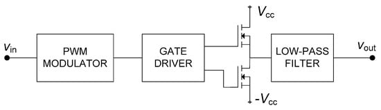 Block diagram of a half-bridge class-D power amplifier.