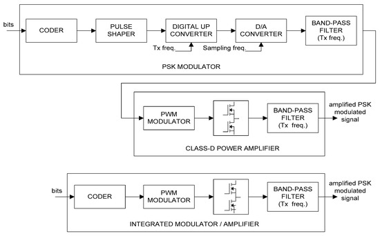 The block diagram of the class-D amplifier is shown in Figure 3. The first block in the diagram is a PW-modulator. The switching block consists of two metal-oxide semiconductor field-effect transistor (MOSFET) and the corresponding gate drivers. If the three diagrams in Figure 1, Figure 2 and Figure 3 are compared, we realize that if the low-pass filter is replaced by a band-pass filter, the high-power output signal will be the carrier modulated in phase by . To improve power efficiency of the wireless communication system, a question arises: As the class-D amplifier already contains a modulator, is it possible to directly drive the PW-modulator with a signal that, when band-pass filtered, becomes the PSK modulation of the digital input? The idea is shown schematically in Figure 4 [15]. Obviously, the coder blocks in the upper and lower parts of Figure 4 will have to be different.