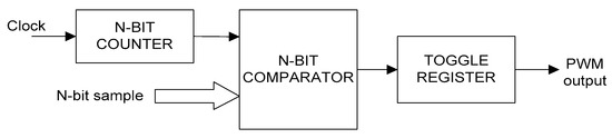A second criterion is related to the fact that the input is a continuous signal but the output signal is a train of pulses, which means that the input signal has been somehow sampled at certain instants. The way sampling is performed also has an impact on the frequency spectrum. There are two options, the so-called uniform sampling, when it is synchronous with the system clock, or the natural sampling, which happens when simple circuits are used to modulate the pulses, i.e., when sampling is achieved by a simple comparator circuit and is not synchronous with the system clock. The basic block diagram of a PW-modulator is shown in Figure 1 [8]. Of course, the average sampling frequency over a long period of time is the frequency of the system clock.
