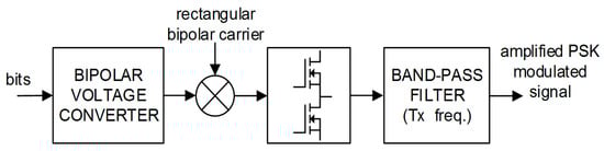 The proposed integrated PSK modulator is sketched in Figure 6. The input data bits are converted to a bipolar voltage signal that eventually multiplies a square bipolar carrier, changing its phase according to the input bit. The square signal then drives the power bridge of the class-D amplifier, whose output goes through a band-pass filter centered at the frequency of the bipolar carrier, to obtain a PSK-modulated signal.
