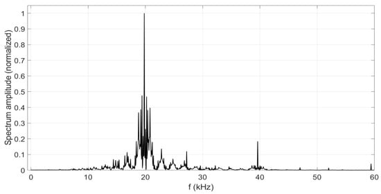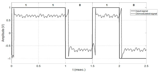 Figure 8 shows the normalized spectrum of the modulated signal at the output of the band-pass filter of the lower part of Figure 4. A MATLAB built-in PSK demodulator (“pmdemod”) has been used to verify that the modulation process was correct. Figure 9 shows the same five bits shown in Figure 7 and Figure 8 after using “pmdemod”.