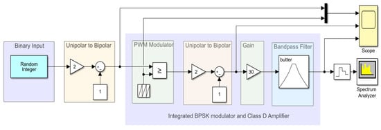 To be doubly sure of the validity of the concept, the circuit in the lower part of Figure 4 has been designed and simulated also with the help of SIMULINK, as shown in Figure 10. A binary input signal with the bit duration time ms is applied to the input of the unipolar-to-bipolar block that converts it into a symmetrical normalized voltage signal ( V). This signal is compared to the sawtooth carrier frequency kHz to obtain a PW-modulated signal. The signal is then converted into bipolar and a gain of 30 is provided to represent the amplification through the power stage as per the functionality of the class-D amplifier. The band-pass filter tuned to the carrier frequency of the PW-modulator output blocks undesired frequency components and provides a PSK-modulated output. A scope and spectrum analyzer are used to measure the output in time and frequency domains.