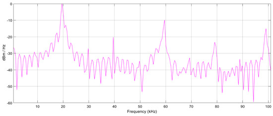 Figure 12 shows the overall power spectrum of the proposed model. As is evident, the fundamental frequency component of the system will have maximum amplitude; it can be observed that at kHz, the third and fifth harmonics are visible at around and kHz, respectively. A band-pass filter tuned at the carrier frequency has been used to eliminate unwanted frequency components and to obtain a binary phase-shift keying (BPSK)-modulated output.