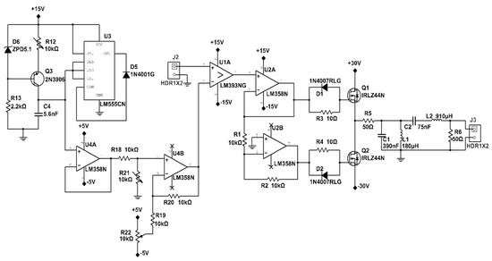 To fully demonstrate the concept, a circuit has been designed in interactive software Multisim [18] that not only provides powerful simulation and analysis, but is also used for the printed circuit board (PCB) design. A schematic of the proposed circuit prototype is shown in Figure 13. The circuit can be divided into five major blocks for better comprehension. On the left side, the 555 timer IC generates a sawtooth waveform of kHz to be used as a carrier, and the OPAMP LM358 shown at the bottom adjusts the gain and offset of the waveform. The second block is the comparator where a binary input signal is applied to the input of the IC LM393, while the carrier is connected to the input. The output of the comparator is a pulse width-modulated (PWM) signal. The third block is the driver circuitry and works as a buffer and designed using IC LM358 to prevent the loading effect and to drive the fourth block, i.e., IRLZ44N Power MOSFET transistors. The amplified signal is fed into the fifth block, i.e., the second-order band-pass passive LC filter circuit removes unwanted signal components and provides an amplified PSK-modulated signal at the output.