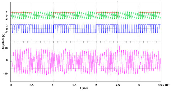Figure 14 shows the waveform acquired from testing the prototype circuit, which is similar to the waveform as obtained in Figure 11 from the simulation. The horizontal axis represents the time in seconds, while the amplitude is shown on the vertical axis in volts. The sawtooth waveform shown in green represents the carrier, i.e., the input of the comparator IC LM393, while the binary input signal is shown in red applied to the input of the comparator. The PWM output of the comparator is shown in blue and passes to the buffers to drive the power MOSFET transistors. Finally, the filter output, i.e., amplified PSK-modulated signal, is shown in purple.