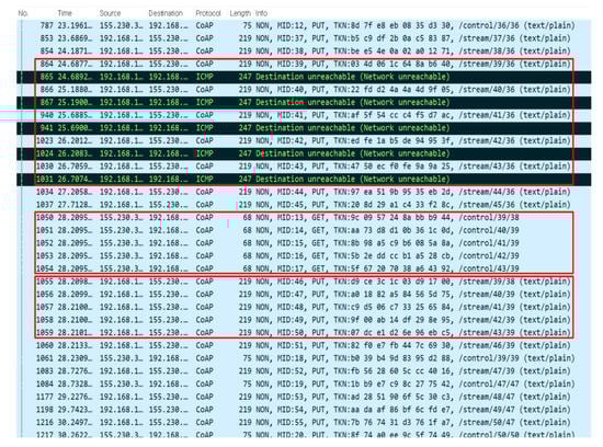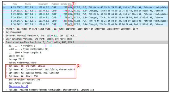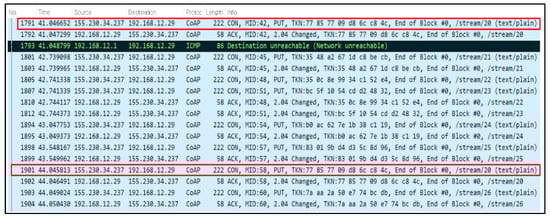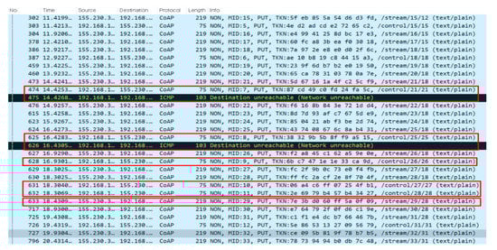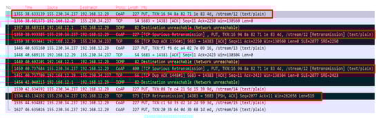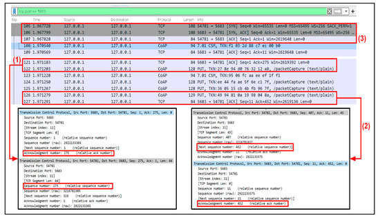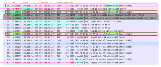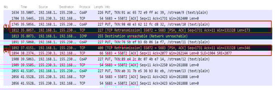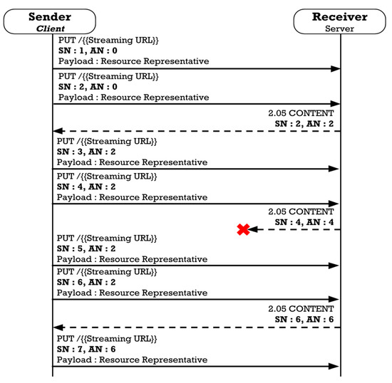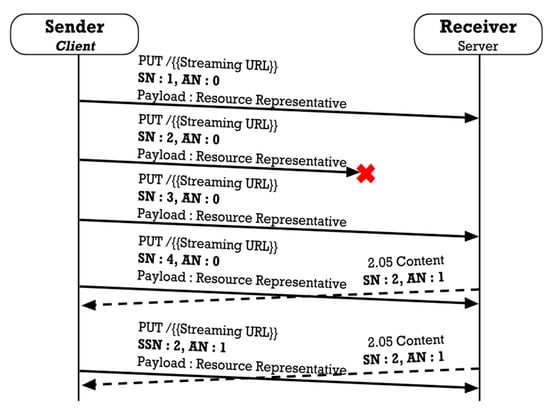 Figure 7 shows the error handling mechanism of CoAP over TCP. In step (1), the PUT message (/stream/10) has been lost, and a retransmission message was immediately sent by the fast retransmission algorithm of TCP. In addition, TCP may reduce the number of retransmissions through linear combinations of the data and cumulative ACK [