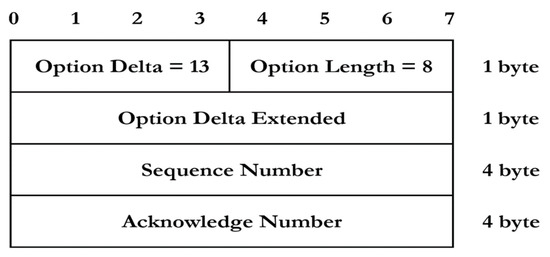 Figure 15, which includes 8-byte Option Delta, 4-byte SN, and 4-byte AN fields. All data messages and ACK messages used for error and flow controls will include this CoAP-SC option. In this Letter, the CoAP-SC option number is arbitrarily set to 100.