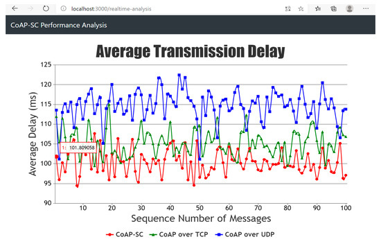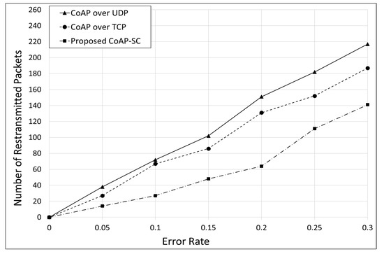 Figure 18 shows the average delays required for transmission of 100 messages sequentially over 10 trials. In this figure, we can see that CoAP over UDP gives larger latency than CoAP over TCP. This is due to the disadvantage of CoAP over UDP, which is retransmitted when a timeout event occurs for a packet loss. In addition, we can see that the proposed CoAP-SC scheme provides lower delays than the existing two schemes. This is because CoAP-SC provides fast retransmission and also because the retransmissions by ACK loss can be reduced.