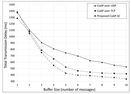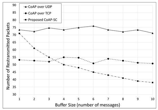 Figure 20 compares the NRP performance for different buffer sizes. The CoAP over UDP scheme provides larger NRPs than CoAP over TCP and CoAP-SC. It is noted that CoAP-SC gives better performance than CoAP over TCP for larger buffer sizes. This is because the proposed scheme can reduce unnecessary retransmissions by using the error handling and flow controls. It is noted that the proposed CoAP-SC scheme performs the flow control, based on the sending buffer. So, the number of ACK messages can be reduced, since the receiver will check the sender’s buffer status by using the SN and AN values. The receiver can also transmit a control message actively so as to flush the sender’s buffer.
