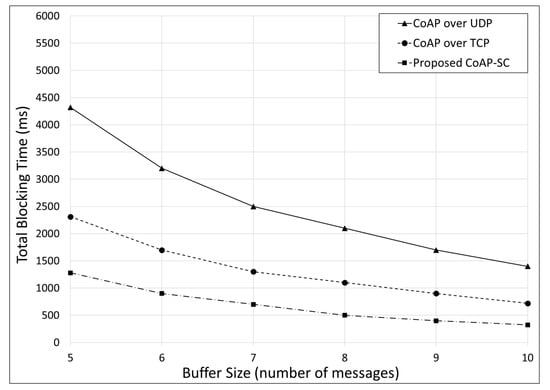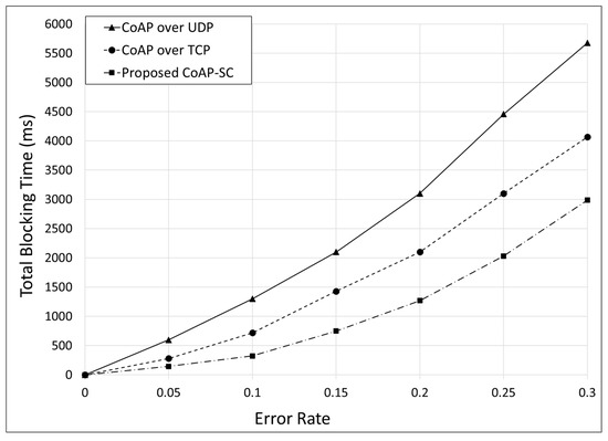 Figure 21 shows the TBTs of candidate schemes for different error rates. All candidate schemes provide almost the same TBTs for low error rates. However, the proposed CoAP-SC scheme gives better performance than the existing two schemes for high error rates. This is because the proposed scheme can perform the flow control effectively even in the lossy network environments. In the CoAP over UDP scheme, the flow control is not performed. So, all messages are removed from the buffer when the corresponding ACK message is received. However, CoAP over TCP provides cumulative ACK with fast retransmission. This makes it less sensitive to the ACK loss event, compared to the CoAP over UDP. In the meantime, CoAP-SC provides cumulative ACK and fast retransmission, as done in TCP. In addition, since the receiver transmits a control message according to the buffer status of the sender, it is helpful to reduce the blocking time.