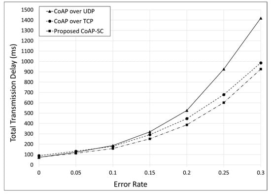 CoAP over UDP performs timeout-dependent retransmission when an error occurs, but CoAP over TCP reduces delay by performing ACK-based fast retransmission. CoAP-SC also performs the fast retransmission. However, unlike TCP, retransmissions will be reduced in CoAP-SC, because the receiver requests retransmission only when the next data message is received. This tends to give the best performance in terms of the total transmission delay for all messages.