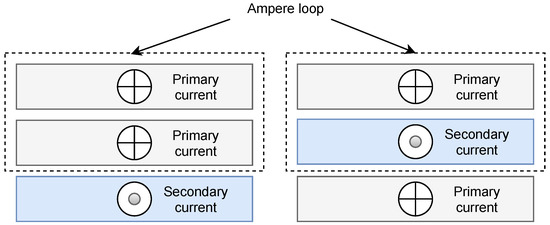At high frequency, a conductor is influenced by time-varying magnetic field caused by itself and adjacent conductors, known as skin and proximity effect and increased AC losses. While skin effect losses depend only on the correlation between the size of the conductor and skin depth, proximity effect losses sharply increase with the number of layers and accounts for a majority part of eddy losses inside a windings [3]. The idea of interleaving primary and secondary windings was presented in some previous articles for both conventional and planar transformer and considered as an effective way to reduce the magnetomotive force (MMF), thus, improving AC losses of windings. In conventional transformers, primary and secondary windings were divided into many layers and wounded alternately around the core. Thanks to alternating layers with opposite currents, the net current in a Ampere contour was decreased in comparison with non-interleaving, thereby reducing MMF and flux density [4] (Figure 1). Some interleaving structures applied in planar transformers were also proposed in References [5,6,7,8] including same layer alternating and multi-layers interleaving. In addition, although interleaving methods are well-known for reducing leakage inductance, however, increasing contact area between the primary and secondary windings has increased parasitic capacitance between windings [2,9]. To be specific, fully interleaving planar transformer with four primary and four secondary layers has equivalent primary capacitance 8.1 times higher than non-interleaving transformer [2]. Besides, interleaving structures also made transformers more complicated to manufacture and impossible to design when windings have few turns.