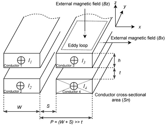 where is the total AC resistance of a conductor, at 0 kHz. Magnetic fields and can be approximated by using the average value at the center of the conductor’s cross-section and they can be assumed to be uniform along the width (W) and thickness (h) of the conductor, respectively. The excitation currents and B fields are calculated at . The total per unit proximity resistance of conductor 3 is shown in Equation (2) [14,22]:
