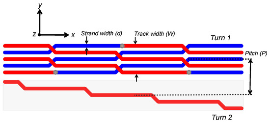 where N is also defined as the number of strands of Litz winding (N = 5 with the design in Figure 4), d and W are the strand width and track width, respectively.