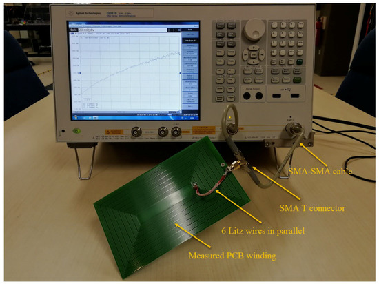 All windings are then produced with the same dimensions and specifications with simulated PCBs. Vector Analyzer Agilent E5061B is employed and ports 1–2 shunt method is used for resistance measurements. The designed fixture with two SMA–SMA connectors is made up as in Figure 6 and connected to PCB under test by six parallel Litz wires. By doing that, the AC resistance of the fixture is kept low in the frequency range to 700 kHz so it does not affect the measurement results. DC resistances of all windings are presented in Table 4. Simulation and experimental AC resistances of three case studies are plotted in the same graph to assess suitability as well as to verify the approximation analysis used.