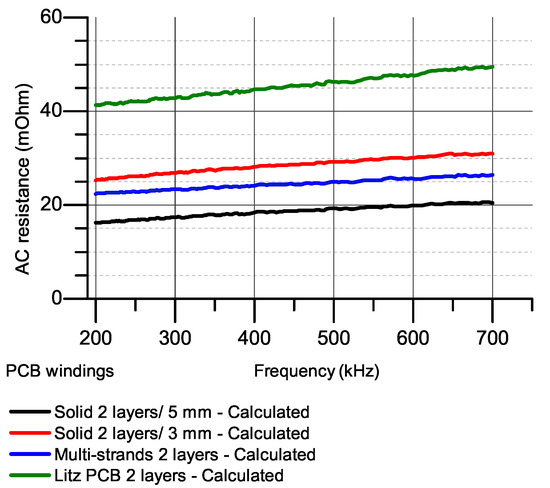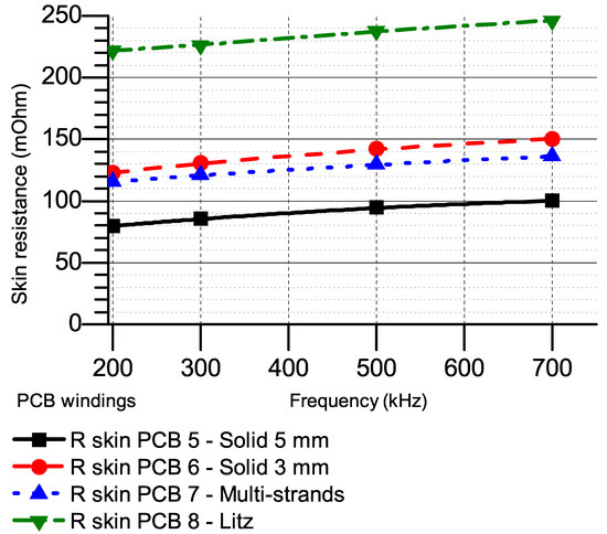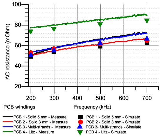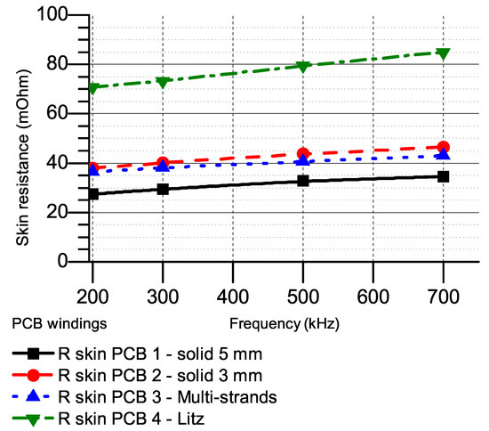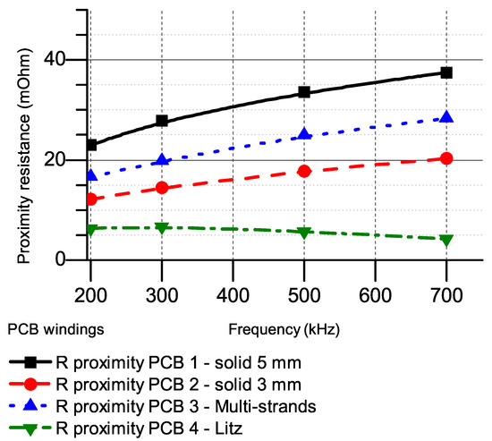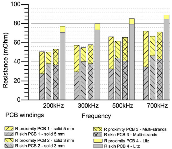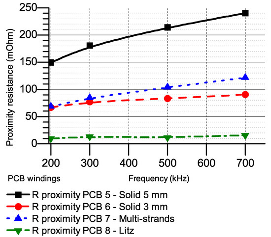 Because Litz winding has two copper layers but solid and multi-strands winding have one layer only. Therefore, to ensure a fair comparison, skin resistance of Litz PCB (PCB 12) is compared to the equivalent skin resistance of a two-layer winding with the same footprint which is a half value of AC resistance of PCBs 9, 10 and 11 and shown in Figure 9. The results show that despite the improvement in the skin ratio, the need to remove too much copper area made the skin resistance of Litz style winding much higher than the other windings. At 500 kHz, of Litz style PCB is equal to 76% of solid 5 mm. However, the cross-sectional area is just 30% in comparison with solid 5 mm two layers. A similar result is also obtained when comparing Litz PCB with multi-strands and solid 3 mm. For solid and multi-strands winding with the same cross-sectional area, as in PCB 10 and 11, the improvement in skin ratio and skin resistance is negligible, the difference is about 5–8% at 500 kHz and 700 kHz. These simulations and measurements are in accordance with theoretical analysis in the previous section. Furthermore, values will be used to separate skin and proximity resistances in studies 2 and 3.