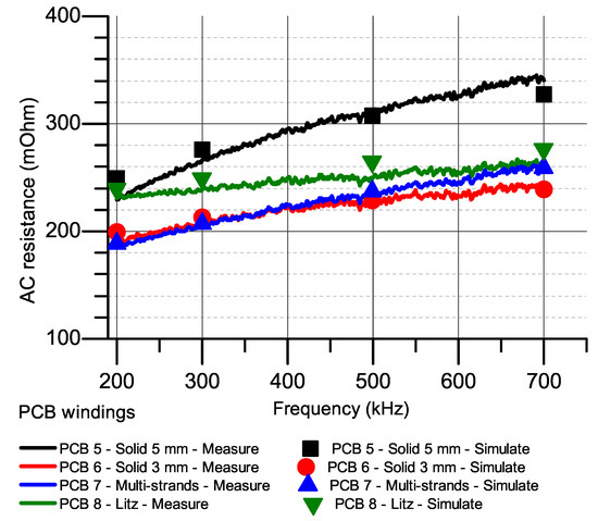 In the last study, windings are designed with seven turns as in PCB 5, 6, 7, 8 on Table 3 and Figure 15. The measurement and simulation steps are also repeated as in Case Study 2 and results are shown in Figure 16, Figure 17, Figure 18 and Figure 19. PCB 5 with track width 5 mm has the highest AC resistance because it is mostly influenced by proximity effect. At 500 kHz, these values are and , which proximity resistance is about 2.26 times compared to skin resistance. Therefore, optimal methods need to be applied to reduce this value. Optimal methods show a significant improvement in AC resistance at high frequency because they have eliminated a majority of proximity resistance. These values are , and at 500 kHz, which is many times smaller than proximity resistance of PCB 5. PCB 5 and 6 have the same AC resistance in the frequency range to 500 kHz and then the AC resistance of PCB 5 is smaller than PCB 6 at 700 kHz. This is consistent with the theoretical analysis in the previous section and again shows the stranded winding does not have much help in reducing AC resistance compared to reducing track width. Litz PCB in applications with many turns windings has shown a significant improvement in AC resistance compared to maximum track width. However, because of keeping AC resistance stable at high value in a wide frequency range has made worse losses in the low frequency region.