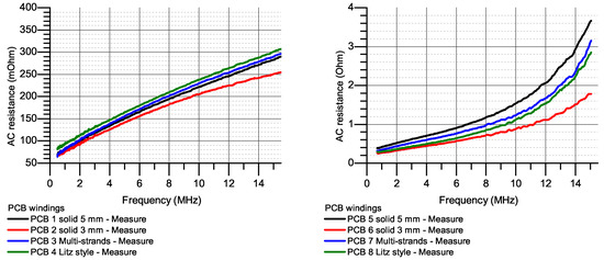 To better understand the behaviour of different PCB windings, measurements are done in a range from 1 MHz to 15 MHz, which is known as frequency range of higher order harmonics of power converters. Because impedance of 3-turn and 7-turn PCB windings become larger in this range, the port 2 reflection method is used to measure and extract AC resistances and impedance of PCBs 1–8 windings. Measurement results in Figure 20 show that improving AC resistance by reducing track width still gives a good result over a wide range of frequency.