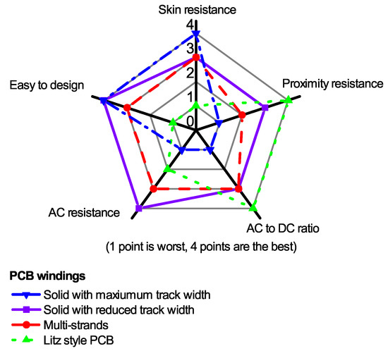 Simulation and measurement results, along with mathematical analysis, have shown the pros and cons of each improvement. The AC to DC ratios between the two winding groups with different number of turns in Figure 21 show that Litz PCB has a stable total AC resistance to DC resistance ratio () when both the frequency and number of turns of windings have changed. However, the need to eliminate a large copper area has made Litz winding worse resistance than adaptive solid winding. Figure 21 also shows that the Fr value should not be used to evaluate the improvement of AC resistance and the performance of an optimal method. Therefore, five comparison points, including skin resistance, proximity resistance, AC to DC ratio, total AC resistance and complexity should be taken into consideration when choosing a PCB winding design, as presented in Figure 22. At low frequency, the winding resistance is determined by skin resistance, which is directly related and tends to decrease as the conductance cross-sectional area increases. At high frequency, or when the proximity effect becomes serious, optimal methods should be applied to reduce winding losses. The use of multi-strand winding is not recommended due to its complex design and unclear performance while the use of solid PCB with optimal track width shows a clearer improvement in AC resistance. Litz style PCB, which is well known for its AC on DC ratios and very good proximity resistance should be used for winding that have many turns or in equipment that needs stability of resistance in a wide frequency range.