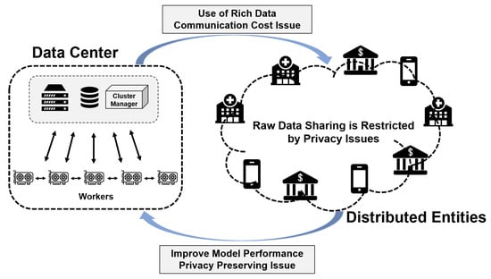Deep neural networks have demonstrated strong performances in several machine learning tasks, including speech recognition, object detection, and natural language processing. Using large quantities of training data and complex neural network architectures make it possible to generate high-quality models, which has pushed these systems into applications requiring more computing resources as well as larger and richer datasets. To deal with the larger workloads, data centers have implemented distributed neural network training techniques []. To efficiently utilize high-performance computing (HPC) clusters in distributed training, a number of techniques including synchronous and asynchronous updates [], compression and quantization [], and hierarchical systems [] have been considered. However, traditional distributed learning requires the collection and sharing of data from multiple entities to a central data center. Collecting the data from multiple entities to a central data center limits the application of deep learning algorithms to several disciplines which have data privacy-preserving issues. For example, the data created by distributed mobile devices were wealthy as the data gathered by the central data center, but this rich data is privacy sensitive which may preclude integrating to the central data center. In addition, disciplines such as medicine and finance have employed deep learning algorithms with remarkable success; however, the shortage of data arising from the limitations of sharing privacy sensitive data between data sources is a critical issue [], as shown in Figure 1.