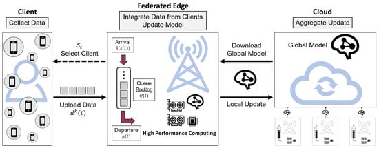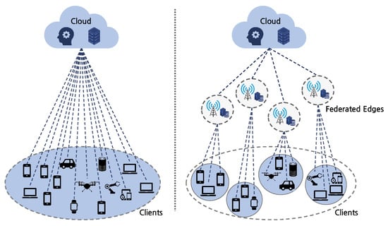 The communication burden on the server, generated by the updating of millions of clients, causes significant bottlenecks when scaling up distributed training. To address this communication bottleneck, several techniques, including compression [,] and efficient client selection [,] have been considered. Various studies have aimed at reducing the communication costs between the clients and server; however, implementing edge computing is the most efficient and practical way to manage numerous clients [,,,], as illustrated in Figure 2.