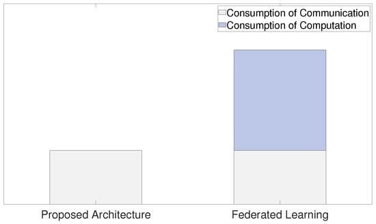 The system model of this work considers a federated learning edge environment that includes clients, federated edges, and a central cloud server, as illustrated in Figure 3. Clients communicate with the associated federated edge and, if selected by it, send it the collected data. A high-performance computing system and data queue are required in federated edges. Although traditional FL considers the environment in which data-acquiring clients perform local updates of the global model (downloaded from the central server), we consider the environment in which the federated edge gathers data from the associated clients and performs the local updates with this gathered data. Because the federated edge gathers data from the clients and uploads the local updates, it can relieve much of the communication burden of the central server and reduce the long delays incurred through the direct uploading/downloading of local updates/global models by clients. Furthermore, conducting local updates using the copious computation resources of a federated edge could alleviate the battery and straggler problems caused by the consumption of client batteries when performing local updates and the heterogeneity of the clients’ computation resources, respectively. Figure 4 shows the reduced battery consumption of client in our system model.