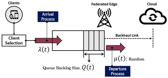 where , , and indicate the queue-backlog size at the edge at time t, the amount of data arriving from the associated clients at time t, and the amount of data departing to the cloud server at time t, respectively. In this case, the departure at time t (that is, ) is not controllable because the edge can only transmit data from the queue to the extent that the wireless channel (between the edge and the cloud server) permits it. The quantity of data arriving from the clients to the edge is controllable, being dependent on the number of selected clients.